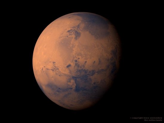 No centro da imagem observa-se cerca de metade da extensão de Valles Marineris e a norte Chryse Planitia. Créditos: NASA.