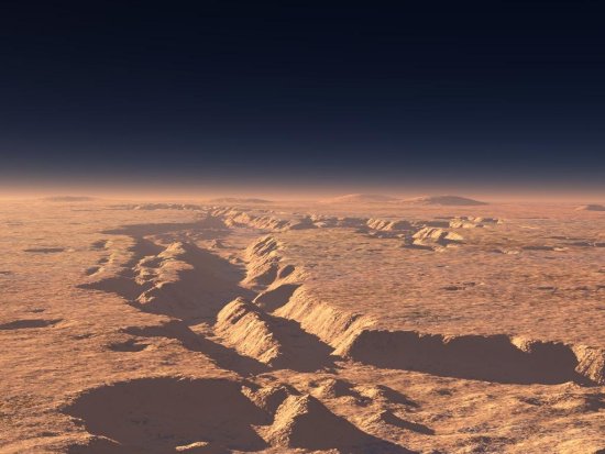 Pormenor de Valles Marineris. Vista de Este para Oeste. Ao fundo, da esquerda para a direita, observam-se os vulcões de Tharsis, Monte Arsia, Monte Pavonis, Monte Olympus e Monte Ascraeus. Créditos: Space4Case.