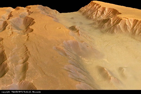 Coprates Chasma. Nas paredes do vale é possivel observar camadas alternadas de material mais escuro e mais claro. O Norte encontra-se para a direita. Créditos: ESA/DLR/FU Berlin (G. Neukum).