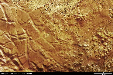 - Numerosas estruturas em forma de cone, com algumas dezenas de metros de diâmetro, que se estendem na superfície de escoadas de lava recentes. Na Terra, figuras semelhantes a estas são conhecidas como “desenraizadas” uma vez que não estão posicionadas sobre uma fonte de magma. Estas pequenas estruturas poderão ter sido produzidas pela interacção de lava com um meio rico em água, assim sendo, estas pseudo-crateras têm uma relevante importância na pesquisa de água sub-superficial ou gelo.